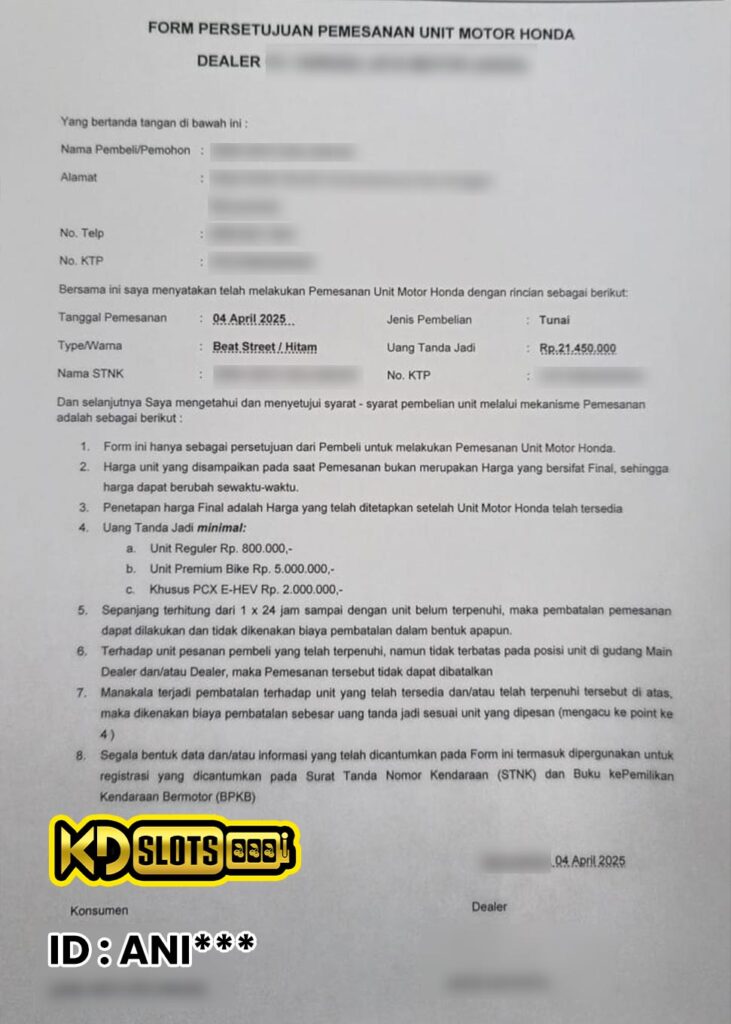 Selamat kepada member KDSLOTS user ID ANI*** Telah berhasil mendapatkan HONDA BEAT STREET dari KDslots di spesial promosi KDSLOTS X TIKET UNDIAN SPESIAL LEBARAN 2025. Kami mengucapakan banyak Terima Kasih kepada pemenang karena sudah mempercayakan kami sebagai Bandar Terpercaya dan terbesar di Indonesia. Masih ragu dengan KDslots? Dimana ada situs game online yang terpercaya, terbesar dan banyak pemain kalau bukan di KDslots